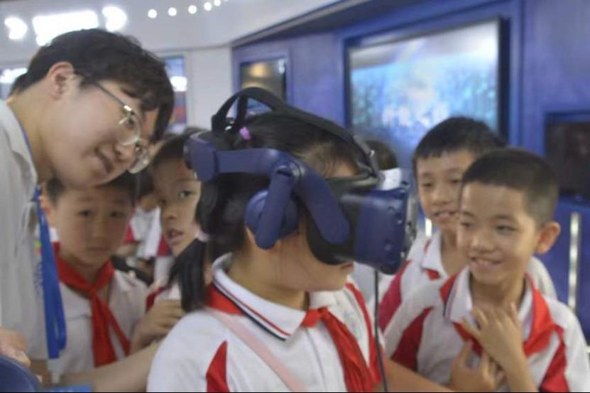 在中南大学先进轨道交通科普基地的科普馆,志愿者李熠、江居瀚、彭程通过科普馆内特有的飞屏、触摸关联屏和VR互动等多种科普展示技术向队员们展示了轨道交通的基础知识与前沿科技,帮助队员们进一步了解轨道交通知识。在VR互动体验区,队员们体验了地铁车站场景,对地铁站的设施、车内零部件、车辆组成等有了更加具象化的认识。