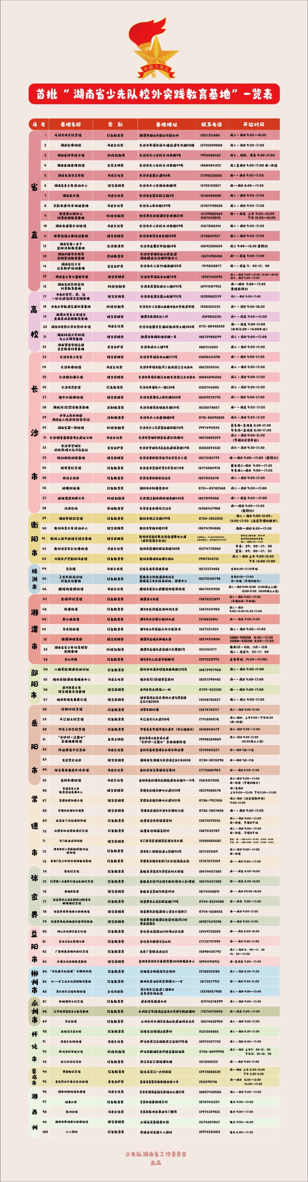 为深入贯彻落实党的二十大精神,深学笃行落实习近平总书记关于少年儿童和少先队工作的重要论述,全面落实《中共中央关于全面加强新时代少先队工作的意见》和《中共湖南省委关于全面加强新时代少先队工作的实施意见》精神,加快落实《关于构建新时代湖南少先队社会化工作体系的实施意见》要求,建立校内外互为补充、有机联动的少先队实践教育体系,进一步推动新时代全省少先队社会化发展,经单位自主申报、市州审核推荐、省级综合评定,团省委、省少工委决定命名毛泽东同志纪念馆等100家单位为首批湖南省少先队校外实践教育营地(基地)。