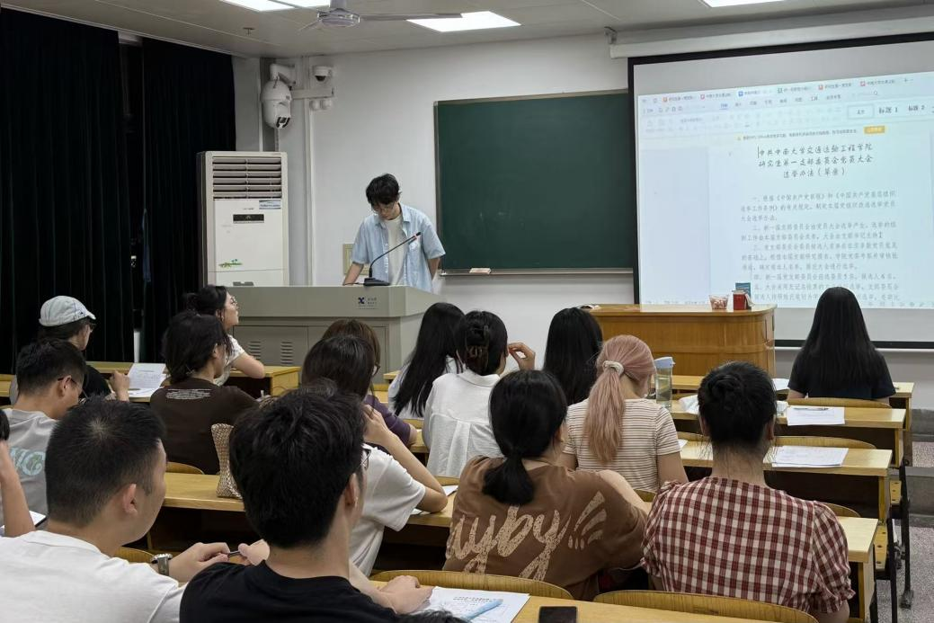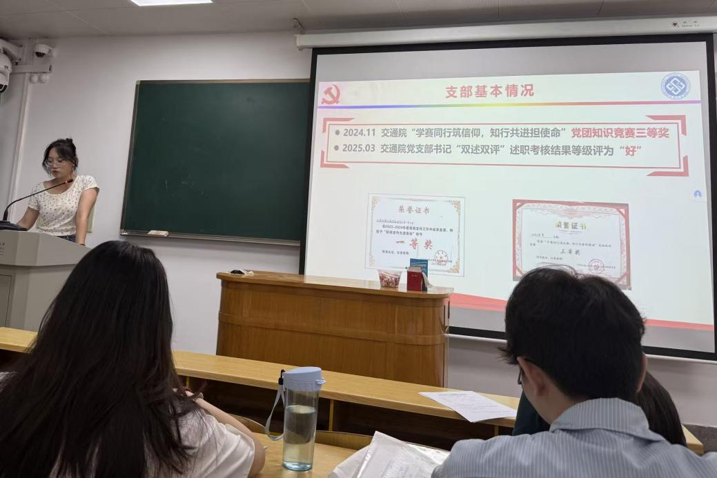 会议伊始,周婧盈同志从“支部基本情况”、“五化引领聚合力,推进党建责任走深走实”、“四维协同争一流,驱动支部建设提质增效”三个方面进行阐述,对2024-2025年度支部的工作情况进行汇报。研究生第一党支部在过去一年中荣获了交通学院党支部书记“双述双评”述职考核“好”等级、交通运输工程学院“学赛同行筑信仰,知行共进担使命”党团知识竞赛三等奖等多项荣誉,并且被评为样板党支部。