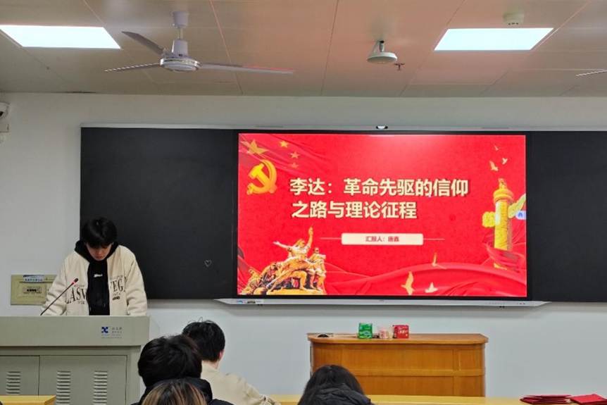 会议第一项议程为微党课分享。支部党员唐鑫同志以“李达:革命先驱的信仰之路与理论征程”为主题,带领全体党员重温了中国共产党主要创建者之一李达的革命传奇。分享聚焦李达从“教育救国”、“实业救国”到“革命救国”的理想抉择,回顾了他传播马克思主义、参与建党实践、坚守抗战气节的关键历程,生动展现其救国为民的赤子初心与执着求真的精神品格,引导党员从先驱事迹中汲取奋进力量,凝聚思想共识。