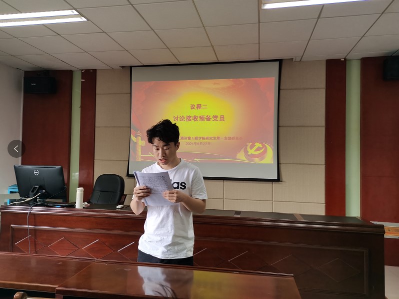 大会伊始,支部成员全体起立,奏唱国歌。随后,在黄裕同志的主持下,支部大会讨论接受预备党员的事宜。钟林环、张泽、苏慧杰、杨伟婷、鲁佳琪五位发展对象依次上台宣读自己的入党志愿书,入党第一、第二介绍人依次介绍其基本情况并就其是否具备入党条件发表意见,支部组织委员蔡明旭同志汇报支部审查结果和支部委员会意见,与会党员进行充分讨论并发表意见。接着,与会正式党员进行了无记名投票,支部纪律委员姚璎华同志宣读了支部大会的表决决议,五位发展对象均以20票全票通过被支部接收为预备党员。