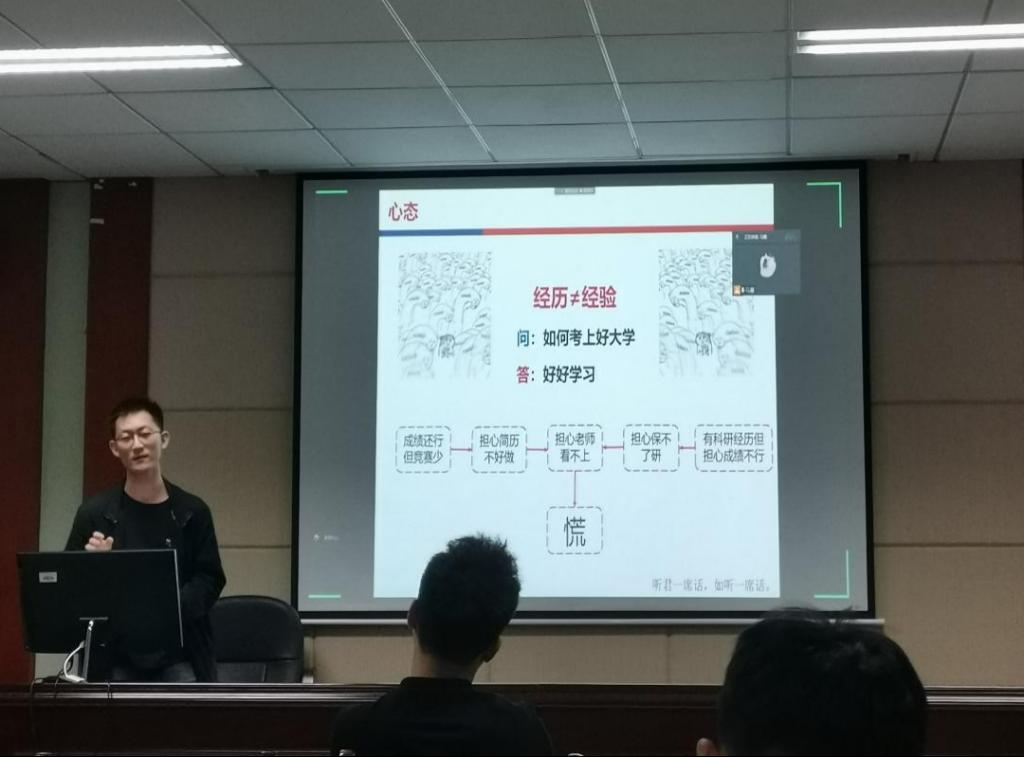 会议第一项,由四位大四学生依次分享自身成功考取研究生、保研、工作的经验。考研至中南大学的韩得民详细地介绍了他的考研经历,从考研书籍到复习时间的规划,面面俱到,为正在准备考研的同学们提供了极有价值的参考。随后,唐昀昭结合自身的就业经历给大家了几点建议,一是早做准备,不慌忙就业;二是多去尝试,多为自己争取机会;三是在面试的过程中要不断总结反思,积累经验。接着,保研至清华大学的刘斯源从控制专业的角度详细讲解了控制专业的院校选择问题,详细介绍了保研夏令营前期资料的填写方法,并结合自己在面试中遇到的问题分享准备面试的经验。吕鹏翔则以诙谐幽默的方式分享了自己保研至本校的经历,鼓励同学们放平心态、勇于尝试。