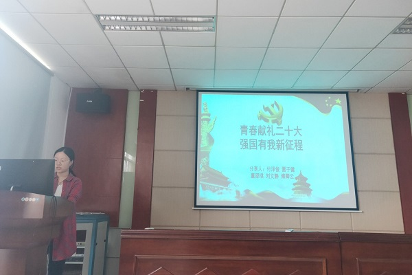 第二组围绕“青春献礼二十大,强国有我新征程”进行研讨展示。该小组首先介绍了二十大的相关理论知识,有助于学生党员更好的理解习近平新时代中国特色社会主义思想,以实际行动喜迎二十大。随后,董邵琪同志对冲锋陷阵的狙击手邹路遥、主张“科研没有死胡同”的博士生导师马瑜婷和哈尔滨师范大学优秀学生刘羲檬的事迹进行详细介绍,勉励大家以青春为底色,脚踏实地、踔厉奋发,为祖国发展做出贡献。