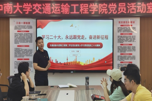 11月12日上午9:00,交通设备与控制工程第二学生党支部于铁道校区第一综合实验楼党员活动室集中学习党的二十大精神。此次会议由支部副书记曾炜强同志主持。会议通过红色影片赏析、党的二十大知识竞赛、党支部书记讲党课等形式,普及党的理论知识,增强党员党性修养。