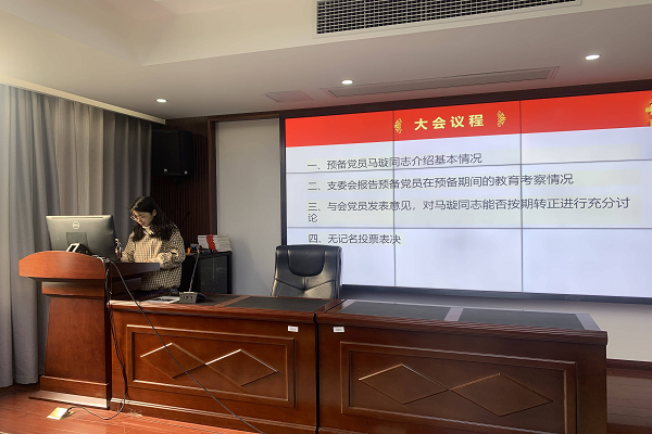 会议伊始,朱创宇同志介绍了会议主要流程及注意事项。会议具体按以下五个流程进行:一为马璇同志宣读《转正申请书》;二为支委会对马璇同志在预备期内的教育考察情况等方面提出转正意见;三为与会党员发表意见,对预备党员同志转正问题进行充分讨论;四为组织无记名投票,清点票数,宣布选举是否有效;五为宣布投票结果,支部书记宣读支部大会的表决决议。