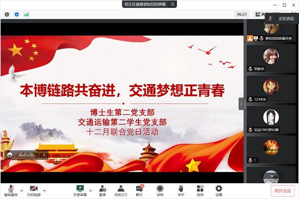 1月5日晚上20:00,交通运输第二学生党支部、博士研究生第二党支部联合于线上举行“本博链路共奋进,交通梦想正青春”党日活动。本次活动面向全院本科生,有来自四个年级的70余名同学参加,活动由曾怡佳同志主持。