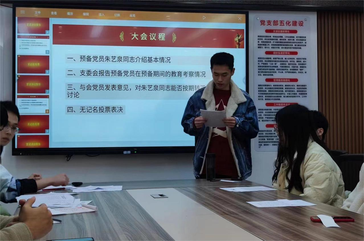 经无记名投票表决,与会有表决权的正式党员一致同意侯睿哲、朱艺泉和胡淦三位同志按期转为中共正式党员。三位同志均表示在今后的工作和生活中,将会时刻以一名共产党员的标准来严格要求自己,时刻接受各位党员同志的监督和批评,不断加强学习,勇于实践创新,努力提高自身的综合素质。