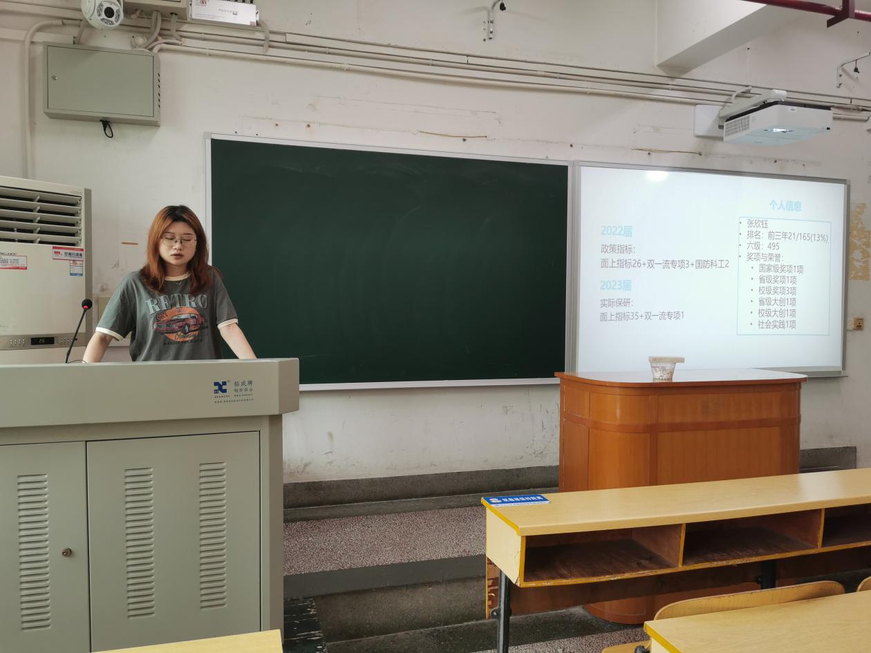 张欣钰同志以“保研边缘人如何自救”为主题详谈了她在大三时期为争取保研名额而做出的努力。她指出,专业成绩是性价比最高的投资;大三是大学四年中专业课占比最高的学年,有许多占据了高学分的必修课,在这些课上获得优异的成绩就有可能实现弯道超车。除此之外,竞赛也是“自救”的另一种途径,广泛地去选择各类有把握的竞赛,能够让想要保研的各位获得一笔可观的附加分。