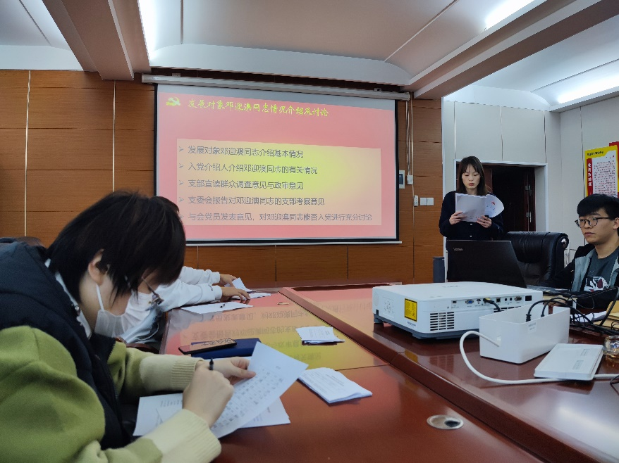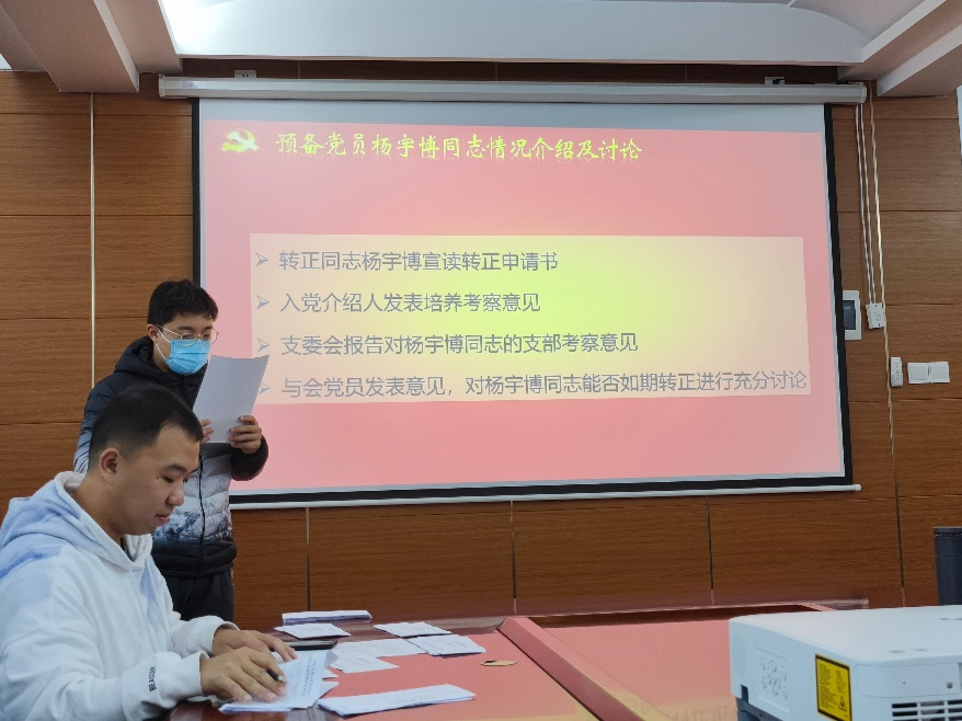会议伊始,郭智同志对参会情况和大会流程作简要介绍。随后,邓迎澳、马荣谦两位同志一次宣读《入党志愿书》,汇报了本人基本信息、入党志愿、主要经历和家庭关系等。两位入党介绍人发表意见,支部宣读群众调查意见与政治审查情况,与会党员发表意见。之后,支部依次讨论了邓迎澳、马荣谦同志的入党问题,并进行了无记名投票,根据投票结果,两位同志被支部接收为预备党员。