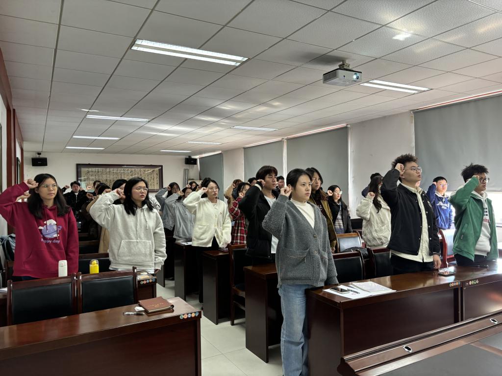会议第三项,组织委员李涵同志宣读支部委员会关于对李胜楠、杨叶凡两名发展对象的审查情况报告。支部大会采用无记名投票的方式对两名同志的接收问题进行表决。根据投票结果与支部大会讨论决定,同意接收李胜楠、杨叶凡两名同志为中共预备党员。会议第四项,由章孟丹同志带领在场全体党员同志重温入党誓词,大家高举右拳,面对党旗庄严宣誓,再次感受思想的洗礼和升华。