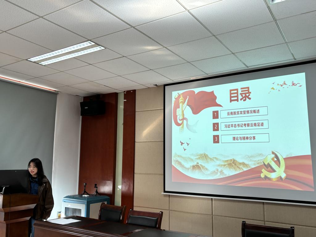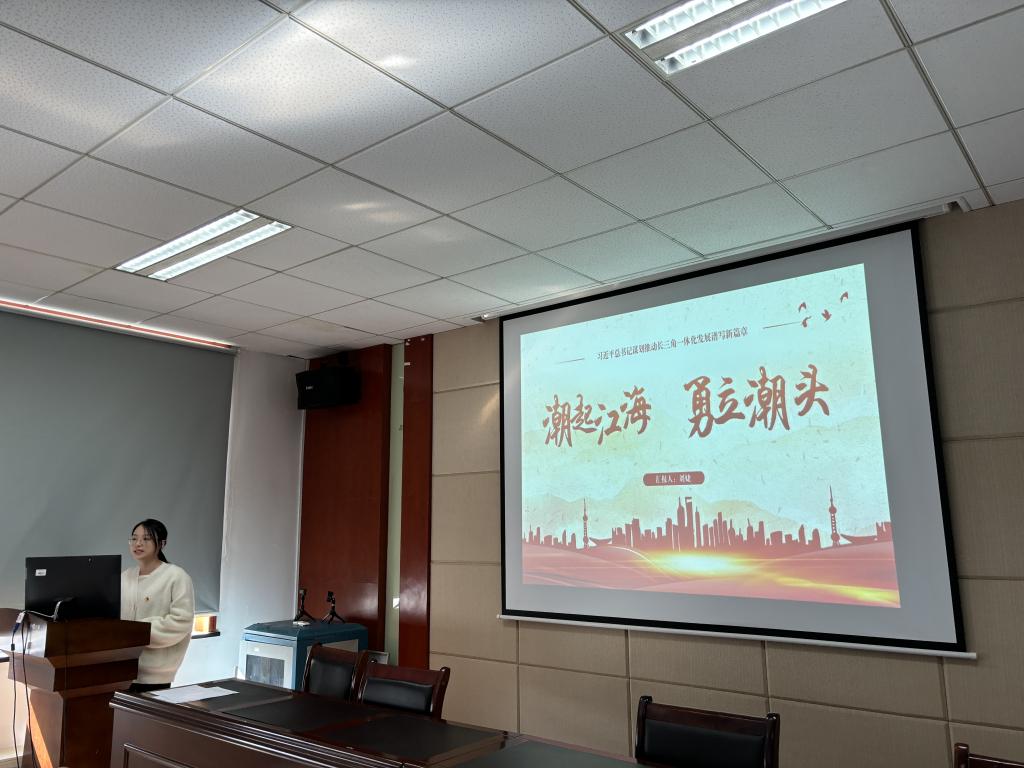 最后,王紫煜、刘婕两位同志为大家带来微党课的内容分享。王紫煜同志分享了习近平总书记在她的家乡云南考察的故事,云南人民在习近平总书记的指引下,大力推动经济发展和民族团结,日子越过越红火。刘婕同志则以长三角一体化为切入点,介绍了习近平总书记在经济发达地区的统筹布局。