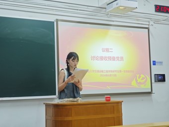 会议伊始,周婧盈同志介绍了会议的流程及要求。首先,支部大会对接收预备党员相关事宜进行讨论。吴采仪、张璐两位同志依次上台宣读《入党志愿书》,并详细介绍其个人基本情况、入党动机以及理论知识学习情况。经支部党员充分讨论并发表意见、正式党员无记名投票后。两位发展对象均全票通过,被支部接收为预备党员,支部副书记赵明慧同志宣读了表决决议。