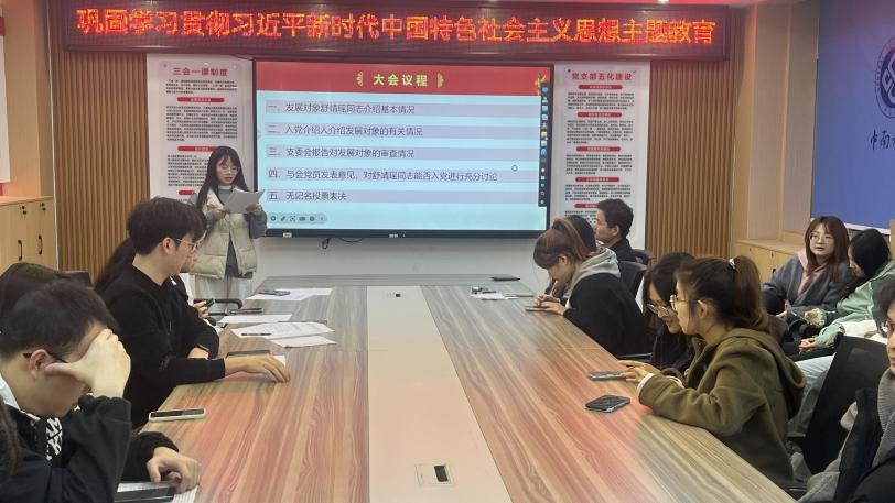 首先,三位发展对象彭哲同志、谢姝洁同志、舒靖瑶同志分别介绍自己的基本情况、入党动机、对党的认识、现实表现等,然后三位同志的入党介绍人对她们的主要情况进行介绍,并对她们能否入党表明态度;支委会报告对发展对象的审查情况及征求与会党员意见,对三位同志能否入党进行充分讨论;接着,大会采用无记名投票方式对三位同志进行表决。
