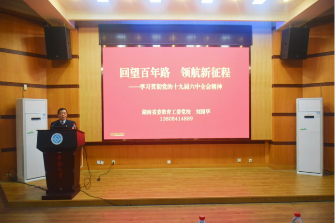 刘国华教授以“回望百年路,领航新征程”为主题,从“重大决议,历史丰碑”、“伟大成就,彪炳史册”、“以史为鉴,开创未来”三个方面展开深入讲解。刘教授首先从两个“百年奋斗目标”的历史交汇点和“两个大局”谋划工作的基本出发点阐述了十九届六中全会的重大历史意义,从四个伟大成就、五大历史意义、十个坚持阐述了重大《决议》的历史意义与现实意义,还通过诠释“美”“好”“幸”“福”“复兴”的基本含义让与会同志真正理解“中国梦到底是什么梦”。紧接着,刘教授带领与会同志一同回顾中国共产党的诞生,中共一大的召开,三大斗争、独立研制出“两弹一星”、党的十一届三中全会胜利召开、改革开放一系列重大历史事件,总结概括了中国共产党从1921年至今取得的伟大成就:开天辟地——夺取新民主主义革命伟大胜利,改天换地——完成社会主义革命和推进社会主义建设,翻天覆地——进行改革开放和社会主义现代化建设,惊天动地——开创中国特色社会主义新时代。刘教授就“遵义会议”强调,与会同志要明确一些重大事件新的历史意义,要与时俱进,对于一些新的修改应铭记于心。最后,刘教授通过深刻分析解读伟大的建党精神和“十个坚持”的历史经验,强调新时代的中国共产党应该牢记使命,举旗定向,以人民至上,从百年历史中汲取力量,埋头苦干,勇毅前行,无愧今天的使命担当,不负明天的伟大梦想。