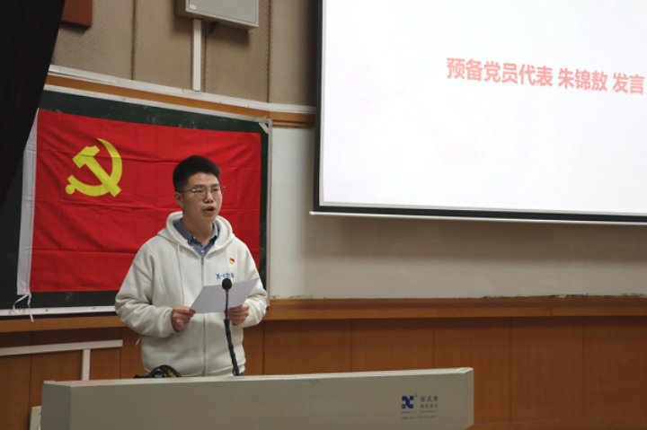接下来,由预备党员代表朱锦敖同志进行发言。他从未来的学习、生活以及工作方面讲述了自己对党员这个新身份的认知,向党组织表明了自己全心全意为人民服务的决心。他引用黄文秀同志和“共和国勋章”获得者张富清同志等优秀党员的先进事例,号召各位党员同志与预备党员把不忘初心、牢记使命作为新时代共产党人的必修课。