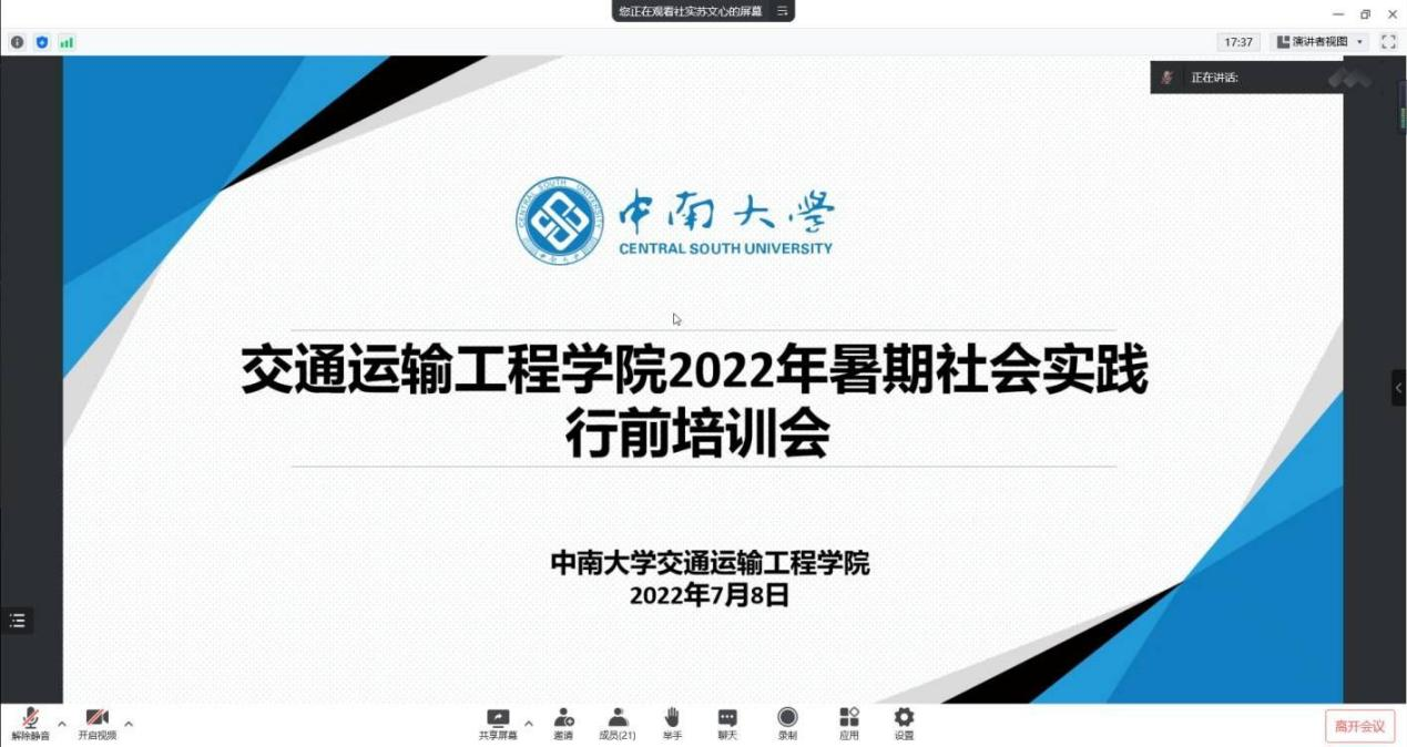 7月8日晚20:00,为落实暑期社会实践相关要求,助力同学们在社会实践中长才干、增本领,出成果,交通运输工程学院以线上形式顺利举办2022年暑期社会实践行前培训会。交通院团委副书记张健老师、郑繁简老师和交通院各暑期社会实践团队参加了本次会议。会议邀请了2021年中南大学赴株洲攸县双凡村志愿支教团队长刘澍芳同学、交通院新闻宣传中心记者团部长李欣语同学分别分享了实践、宣传心得与经验。本次会议由苏文心同学主持。