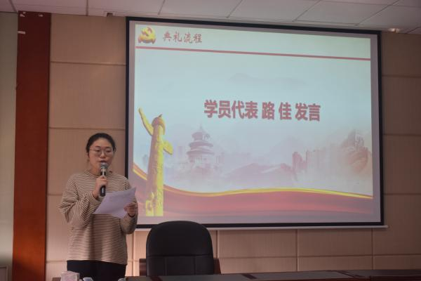典礼伊始,全体成员起立,奏唱国歌。随后,本期培训班学员代表交通设备与控制工程第一学生党支部路佳同学发言。她带领同学们回顾了党的伟大奋斗历程,并结合党的二十大报告呼吁全体同学树立远大理想、练就过硬本领,在学习中增长知识、锤炼品格。最后,路佳同学代表全体学员向党组织郑重承诺,将以积极的态度、饱满的热情投入到培训学习中去,把自己锻炼成为符合党和人民期待的社会主义可靠接班人和合格建设者。