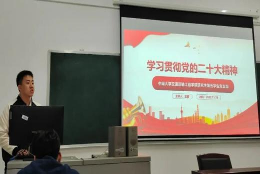 11月19日上午9:00,交通运输工程学院研究生第五党支部于交通楼515开展学习贯彻党的二十大精神专题党课。本次党课由党支部书记王鑫同志主讲,支部全体党员同志参加学习。
