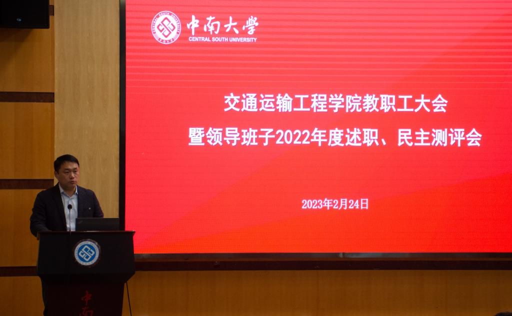 2月24日下午14:30,交通运输工程学院于铁道校区世纪楼C201国际报告厅召开全院教职工大会暨领导班子2022年度述职、民主测评会。学院全体教职工参加本次大会,院党委副书记宋晓东主持大会。