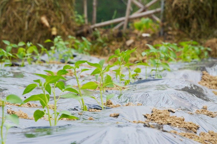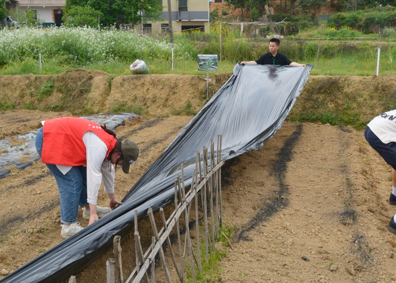第二组为覆膜组,同学们三两搭配,将塑料薄膜整齐覆盖在耕地上,并用土块压边,在保证农作物生长所需的温度和湿度的同时,防止大风危害。