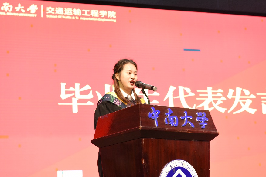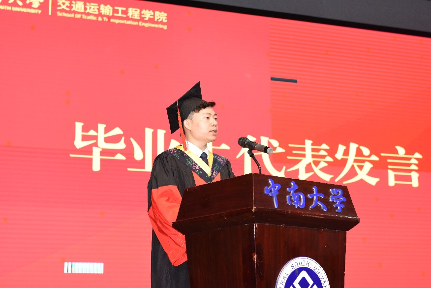 证书颁发完毕后,研究生毕业生代表李翔和本科毕业生代表王尚君同学发言。他们回忆了在中南大学生活学习的点滴经历,回忆了自己为梦想和未来奋斗的青葱岁月,表达了对学校学院和各位领导老师们的感谢、对未来的憧憬和信心,同时祝福母校蓬勃发展、再创辉煌,鼓励各位同学自觉肩负实现中华民族伟大复兴的历史使命,奔赴更为灿烂的明天。