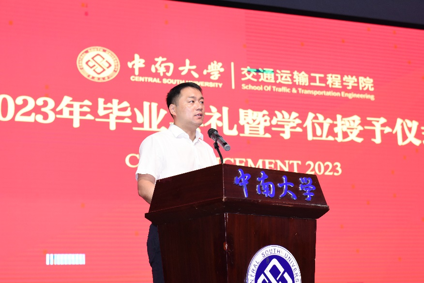 随后,高广军院长发表讲话。首先,高院长对各位毕业生顺利毕业表示热烈祝贺,并细数了同学们在中南大学时光与学院同向同行、合力发展所取得的辉煌成就。之后,他语重心长地谈到:“时代是青年发展最宝贵的沃土,青年是时代发展最蓬勃的动力。”勉励在座学子在面对国家需求时,应勇担时代使命;面对个人养成时,应锤炼品德修养;面对职业发展时,应练就过硬本领;面对前程闯荡时,应发扬中南精神。最后,高院长深情谈到:“青山不改,绿水长流,山水有相逢。亲爱的同学们,请相信,母校永远会是你们的港湾。”