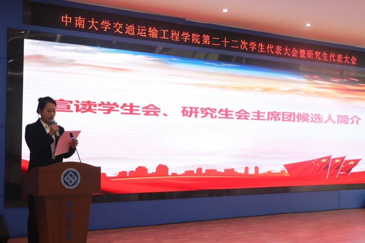 会议进入下一环节,王羽珊、王尚君分别宣读学生会、研究生会主席团候选人简介,并通过各学生代表投票,总监票人、监票人监票,总计票人、计票人计票,选举产生学生会、研究生会主席团以及参加中南大学学生代表大会暨研究生代表大会正式代表。