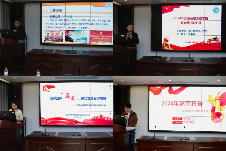 1月16日下午2时30分,交通运输工程学院2024年度党支部书记抓基层党建现场述职评议会在交通楼425室召开。学院党委书记袁世平,党委副书记李苑,副院长韩锟、陈维亚,以及学院各党支部书记参会。会议由张佳琪老师主持。