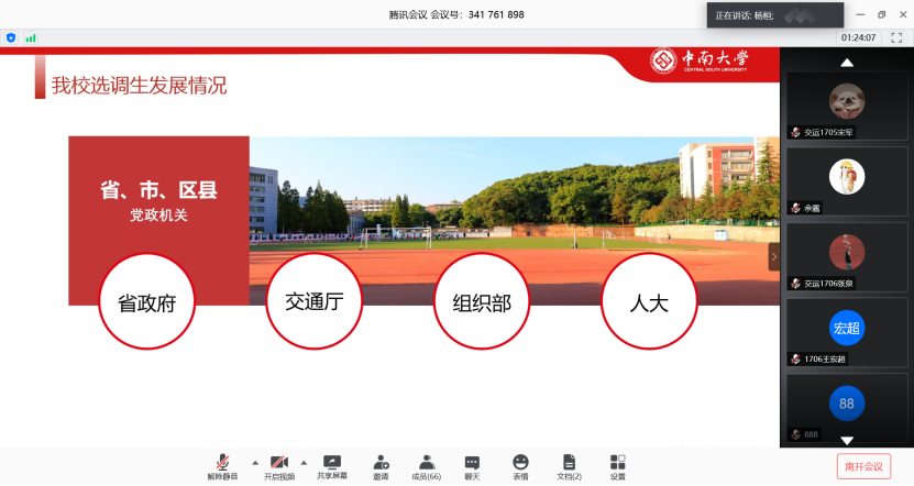5月10日下午三点,由交通运输与物流工程学生党支部组织的“薪火相传·经验交流”第二场——学习、工作、选调生专场分享会在线上平台圆满举行。党支部的四位优秀毕业生陈婉茹、李清韵、颜靖洲、杨桓同志结合自身经验分享了关于学习、就业和考选调生方面的经验技巧和重要信息。本次分享会吸引了60余名同学参与,累计为学弟学妹解答疑问40余条,得到了同学们的一致认可。