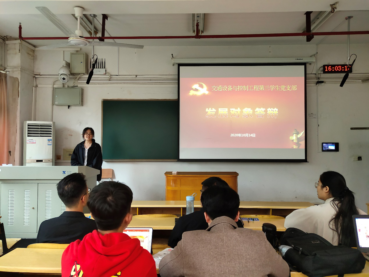 为进一步加强基层党组织建设,保证学生党员发展质量,端正入党动机,推进党员发展公开化、透明化,引导学生树立坚定的共产主义信仰,真正做到从思想上到行动上入党,10月14日下午4点,交通设备与控制工程第三学生党支部在世纪楼A202教室进行发展对象入党公开答辩,支部书记韩艳老师、全体党员参加此次答辩,会议由支部王羽珊同志主持。
