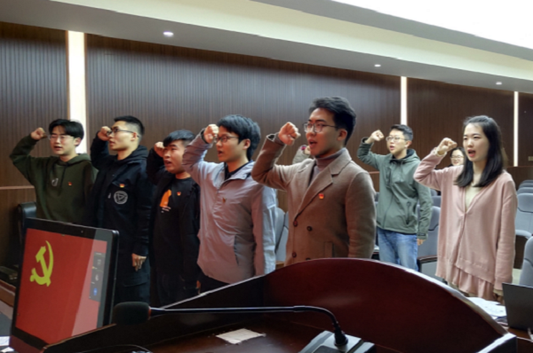 紧接着进行预备党员接收大会。会上,丁一、彭泽胄、郭冬阳、邓涵文、裴晓晖等5位发展对象就本人的基本情况,入党动机,对党的认识等向大会进行了详细的汇报。黄晴同志、苏孟帅同志作为入党介绍人就5位发展对象有关情况及培养过程中的表现向支部大会做了介绍;周翔宇同志与孙光与同志宣读5未发展对象的群众调查意见与政审意见,王羽珊同志宣读支部对5位发展对象的考察意见;最后与会的全体党员本着认真负责的态度对发展对象能否入党进行充分讨论,经大会全体正式党员无记名投票表决,最终同意接收丁一等5名发展对象为中共预备党员。随后会议进行了庄严且隆重的宣誓仪式。