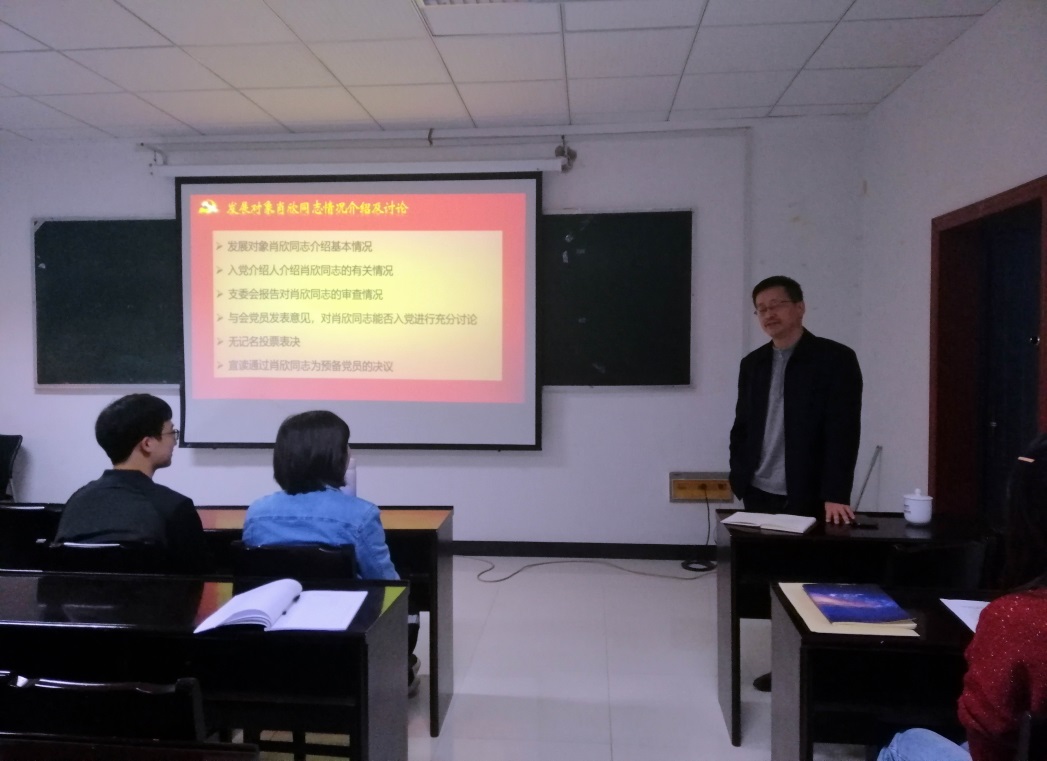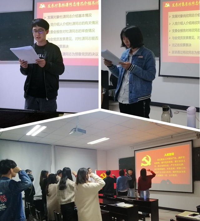 会议伊始,赵苛欣同志清点到会人数。发展党员杜潇与肖欣同志介绍了自己的基本情况,并宣读了《入党志愿书》。随后,入党介绍人也介绍了两位同志的其他情况。介绍人认为杜潇同志用党的理论知识武装自己的思想,积极为人民服务,作风正派;肖欣同志坚持学习党的理论知识,积极参加党的活动,在生活中以党员的标准严格要求自己。接下来,支委会报告对两位同志的审查情况,与会党员充分发表意见,经具有表决权的正式党员无记名投票表决,一致同意接收杜潇和肖欣两名发展对象为中共预备党员。每个党员都是一面旗帜,两位同志表示会以更高的标准严格要求自己,认真对待学习工作中的问题,向身边的优秀党员看齐、学习,以更饱满的热情积极服务同学。随后,支部书记带领两位同志在党旗下完成宣誓,并带领支部其他党员同志重温入党誓词。
