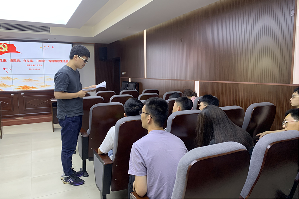 在刘嘉晖同志总结支部工作后,在座同志们分为研二、研三两个党小组就习近平总书记在庆祝中国共产党成立100周年大会上的重要讲话及学习习近平新时代中国特色社会主义思想和党中央指定学习材料进行学习心得分享,并根据党史学习教育目标要求、党员先锋模范作用的发挥进行盘点和检视,开展批评与自我批评。黄德鑫同志对中国共产党成立一百周年感慨颇深,表示在见证党的百年荣光时,我们不仅要心怀感动,更要坚信脚下的道路,筚路蓝缕创伟业,初心不忘再出发。黄湘智同志在阅读《中国共产党简史》后有深刻心得体会,表示我们要以革命先烈、爱国志士为榜样,学习他们的精神,并在时代的背景下进行丰富和发展。刘鑫源同志谈到,对于青年学子,都要做到认真学习、孜孜不倦,正确认识党的光辉历史和伟大功绩,并永远铭记在心。