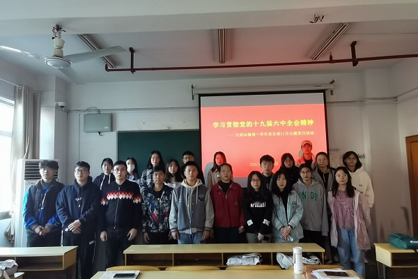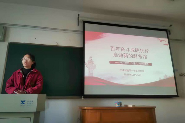 11月25日下午三点,为贯彻学习党的十九届六中全会精神,在总结成就中增强自信,在总结经验中把握规律,交通运输第一学生党支部在世纪楼主楼406教室举行“学习贯彻党的十九届六中全会精神”主题党日活动。本次党日活动由支部书记石晓琪同志主持,支部全体党员同志和发展对象共同参与。