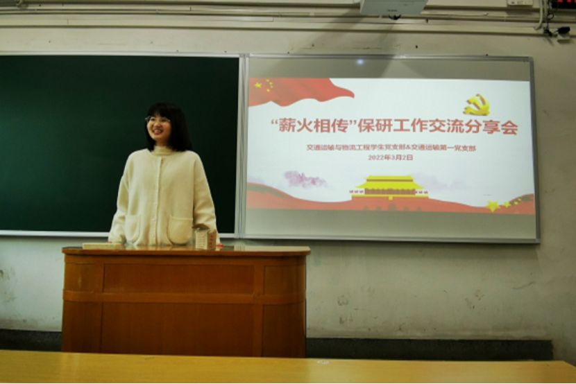 3月2日下午两点, 交通运输与物流工程学生党支部联合交通运输第一学生党支部在世纪楼B202开展“薪火相传”交流分享会之保研与工作专场。本次交流会邀请了汤书宁、蒋欣珏、曹腾、曾凡铭、游弋、杨杰6位18级的同学进行经验分享,近百名交通院的同学参与了本次分享会,会议由支部成员肖奕忆同志主持。