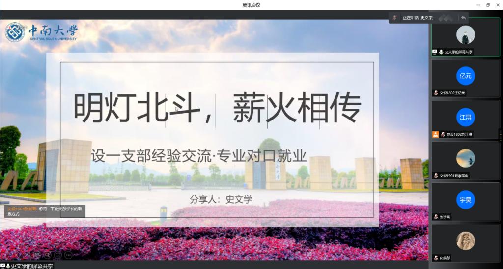 交通设备与控制工程第一学生党支部于4月9日晚七点在腾讯会议平台举办了以“明灯北斗、薪火相传”经验交流分享会为主题的四月党日活动,共计有140余位同学参加。