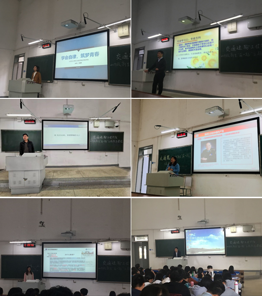 党组织干事韩艳老师围绕“为什么入党”、“怎样认识中国共产党”、“如何加入党的组织”三方面向大一新生讲述了我们国家在中国共产党的领导下所取得的辉煌成就以及入党的程序,引导大一新生坚定理想信念,端正入党态度,树立正确的入党动机。研究生辅导员樊佳俊老师围绕大学生理想信念教育,以生动的例子向在场同学解释理想,阐释信念,引导在场新生思考大学生活之意义,应以青春之我成就中国梦。鼓励同学们艰苦奋斗,将理想付诸行动。黄永明老师以自身为例,引出大学生活应以“适应”与“发展”两个方面展开,从人际交往、专业了解、时间安排等方面为同学们讲授了大学生心理健康与安全的相关知识,同时给出各校区心理咨询中心地址及电话,鼓励同学们用健康良性的方式解决心理问题,培养健康理性的心态。陈晨老师以往届优秀学生为例,向在场新生展示了充实有意义的大学生活之貌,并向在场同学展示了交通运输工程学院优良的学风体系,鼓励同学们加强学风建设,引导在场同学做好自己的大学生涯规划。张佳琪老师以“自律:没你想的难”与“拿奖:没你想的远”两方面为大家分享了大学生日常管理规范与评奖评优制度,从本科生日常行为规范、课堂行为规范、校园行为规范、寝室行为规范、安全意识、防骗意识等多方面向同学们解读了大学生行为准则,并为大家介绍了学校的评奖评优相关政策。曹超老师则以提问解答的方式为在场同学解答了关于大学生价值观的形成、就业保研、转专业等方面的问题,使同学们对自己的未来发展有了不同的思考。
