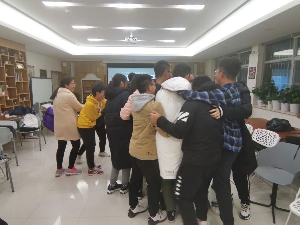 分享过后,主持人组织同学们进行了“找零钱”的小游戏。男生手持五角,女生则有一元,主持人喊了一定的金额,围着圈转的同学就组队紧紧地抱在一起凑成相应金额。两个班级的同学在趣味十足的游戏中熟悉起来,教室里笑声不断,其乐融融。