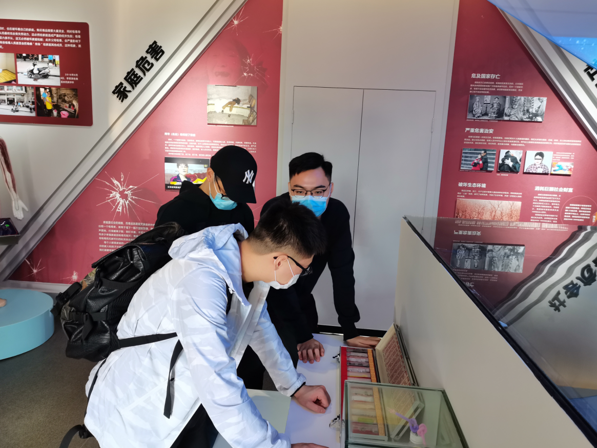 随后,支部全体成员到开福区禁毒基地进行参观学习。进入基地展厅后,基地讲解员陈非同志带领全体同学参观了禁毒基地。陈非同志从“禁毒运动发展历史”、“毒品的种类及特点”、“毒品对人体健康的危害”、“毒品对家庭和社会的危害”以及“当代禁毒手段政策”五个方面为同学进行了系统地讲解。在讲解员的引领下,同学们依次阅读了禁毒基地的电子书,参观了基地内的毒品模型,并利用人体模型了解毒品对于人体健康的危害。参观过程中,全体支部成员认真学习,积极互动,达到了预期的教育效果。