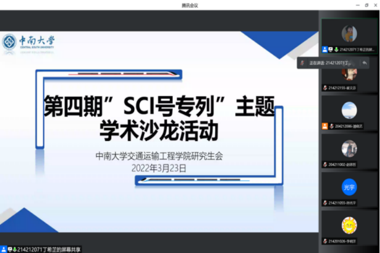 为营造浓郁的科研学术氛围,拓展同学们的学术视野,促进研究生学术成果的经验交流,3月23日下午15:00,交通运输工程学院研究生会举办了第四期“SCI号专列”主题学术沙龙活动。根据学院疫情防控需要,本次活动以线上形式开展。本次学术沙龙活动由赵学艺和李明洋两位2021级博士生担任主讲人,共吸引了210名研究生及本科生参加。会议由交通院研究生会学术部干事丁希芷主持。