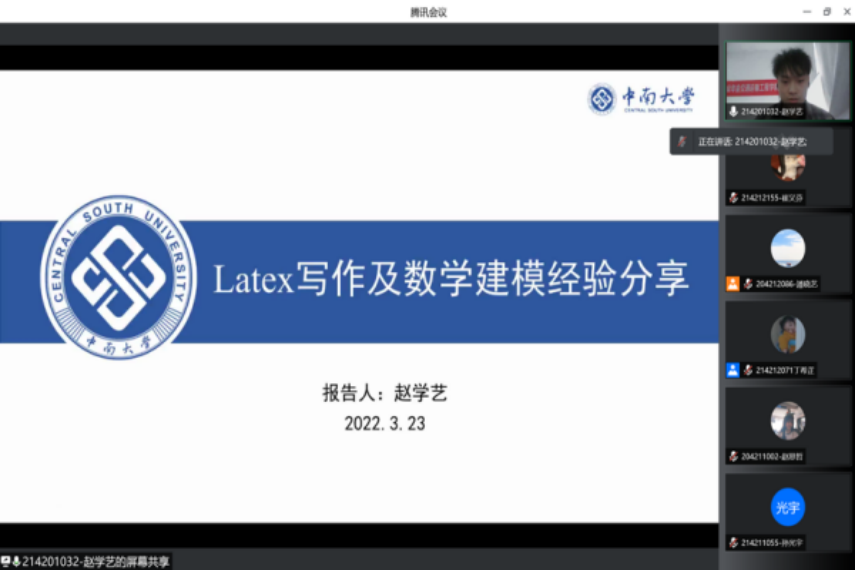 会议伊始,赵学艺围绕“latex写作与数模竞赛经验”主题进行了分享,结合亲身经历分享了科研过程中的创新想法、论文写作工具latex的使用方法、数学建模竞赛的参赛流程等方面的相关经验,并结合科研过程中遇到的具体问题向同学们讲解解决问题的方法,帮助同学们提升了科研写作能力并丰富了竞赛经验。