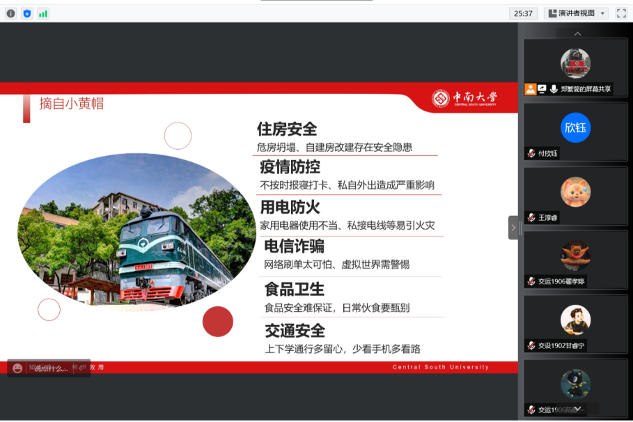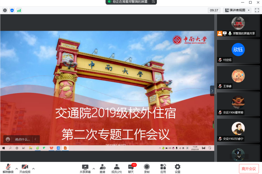 5月8日下午3点,交通院2019级在线上顺利举行本学期校外住宿第二次专题工作会议。交通院19级全体校外住宿同学参加了此次会议,会议由19级辅导员郑繁简老师和生活专干韦玉芹主持。