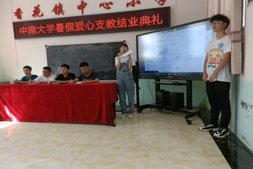 8月12日上午8:00,中南大学赴临武县香花镇中心小学支教队闭幕式正式举行。闭幕式由中南大学学生杨文楠主持,临武县共青团团委书记陈若松、临武县香花镇武装部部长胡康、临武县香花镇中心小学支部书记兼校长周武专、临武县香花镇中心小学安全副校长周武专出席此次活动。