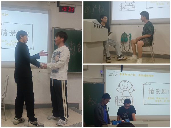 学习环节结束后,王璐同学主持进行专题活动。联合团支部先是进行了有关知识产权的知识竞答。同学们积极举手、踊跃发言,最终物流2101班取得胜利。之后,来自各个团支部的同学们表演了精彩的情景剧,用典型的案例宣传知识产权的相关知识。其中,交运2103班杨柳飞和方子晟同学用幽默的动作、精湛的表演和专业的服装道具给同学们带来了一场别开生面的情景剧。