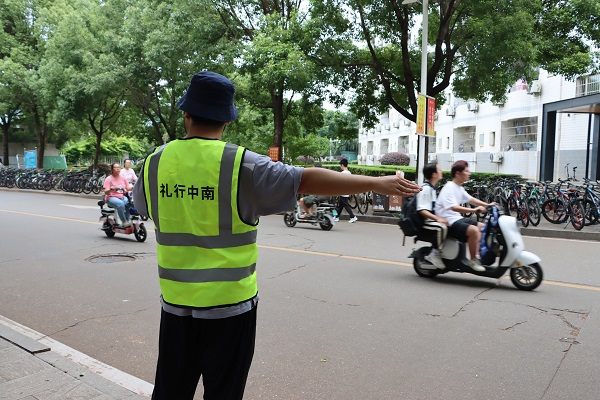 中午11:30-12:30,正值下课高峰期,志愿者祝悠轩、刘砺省在升华公寓门口进行上下课高峰期校内交通疏导工作。为防止上下课高峰期交通拥挤造成事故,他们在升华学生公寓门口维持校内交通秩序,提醒同学们不要擅闯红灯,戴好头盔,礼让出行。