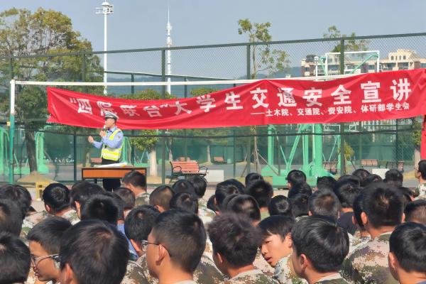 10月24日上午10:00,交通院、土木院、资安院以及体育教研部联合岳麓四中队开展了“四院联合”大学生交通安全宣讲活动,对23级新生进行了交通安全法规宣讲。本次活动由岳麓交警大队四中队陈警官主持。