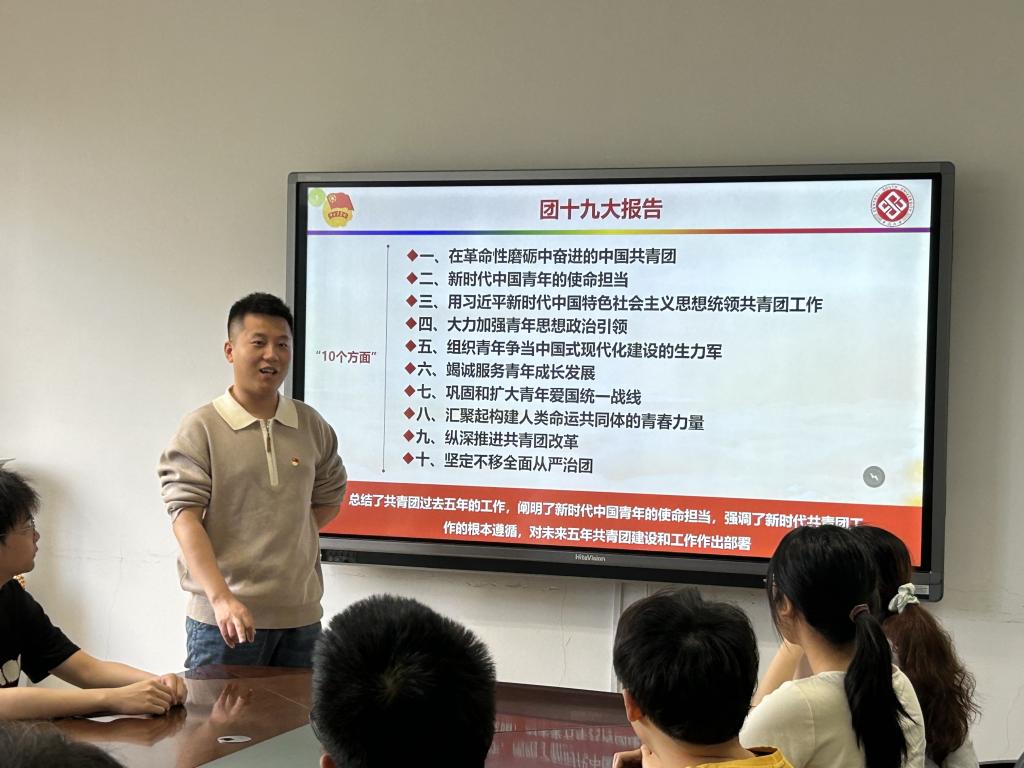紧接着,张健老师带领大家进一步研读了团十九大主题工作报告,与会人员就工作报告涉及的从十个方面展开讨论,成员们纷纷对相关主题进行了讨论阐述,说出了自己的理解与认识。“团干部是党的青年工作的骨干力量,肩负着为党争取青年人心、汇聚青年力量的重要职责,通过学习研读团十九大工作报告,我深切体会到了中国共产党对青年事业的高度关注和关爱,作为一名青年学生干部,我更应该用奋斗装点青春,力争潮头,担当时代赋予的重任”,吉文韬同学说。
