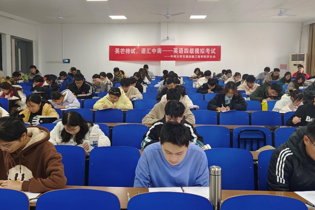 为落实立德树人的根本任务,营造学院良好的学习氛围,培养德智体美劳全面发展的当代大学生,12月11日15:00,交通运输工程学院“英芒待试,语汇中南”英语四级模考活动,在新校区A座201,122开展。本次活动面向交通院24级新生,反响热烈,有近150人参加了考试。