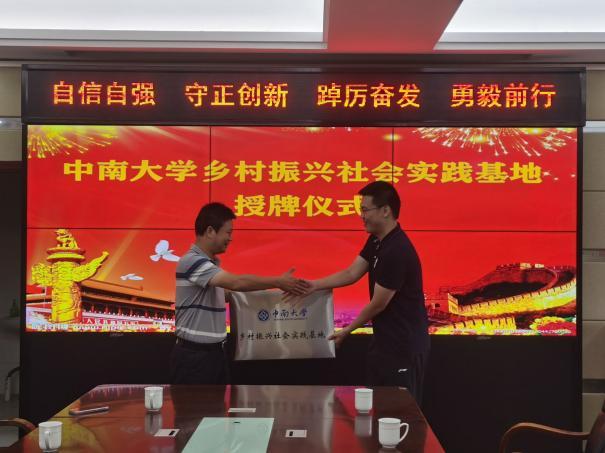 8月29日上午, 临时团支部赴湖南省衡阳市衡阳县台源镇乡村振兴暑期社会实践团前往台源镇举行“中南大学乡村振兴社会实践基地”授牌仪式。“中南大学乡村振兴社会实践基地”于衡阳德源莲业有限公司正式挂牌成立,李镇长代为接牌, 团委副书记郑繁简、台源镇镇长及政府工作人员出席本次授牌仪式。在仪式上,镇长对实践团队寄予了殷切期望,同时也祝愿实践团队能在此次活动中收获良多。
