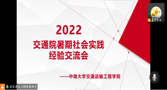 3月19日下午14:30, 2022年暑期社会实践经验分享会在线上顺利举行。部分本科20级、21级学生参加了本次会议。本次会议邀请了交运1801班靳凤悦、物流1901班胡铉宇和交运1802班游弋三位在往年暑期社会实践中表现优异的同学向大家分享经验。会议由苏文心同学主持。 会议伊始,三位同学分别作了经验分享。靳凤悦结合自己三次参加社会实践的经历,介绍了暑期实践的前期准备、实践过程、成果宣传、总结工作的情...